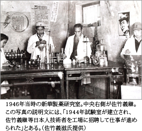 佐竹義継は第13回の「12 流浪のはじまり」のところで少し紹介したが、薬学のエキスパートであった佐竹は、中試の他のメンバーから切り離され単独で八路軍の後勤部に赴任させられた。彼は軍の配下にある新華製薬廠の一等研究指導員という高い地位を与えられ、薬品製造の指導に当たり、長く山東に留まった。佐竹一家が日本に帰国できたのは、人民共和国が成立して4年後の1953年である。